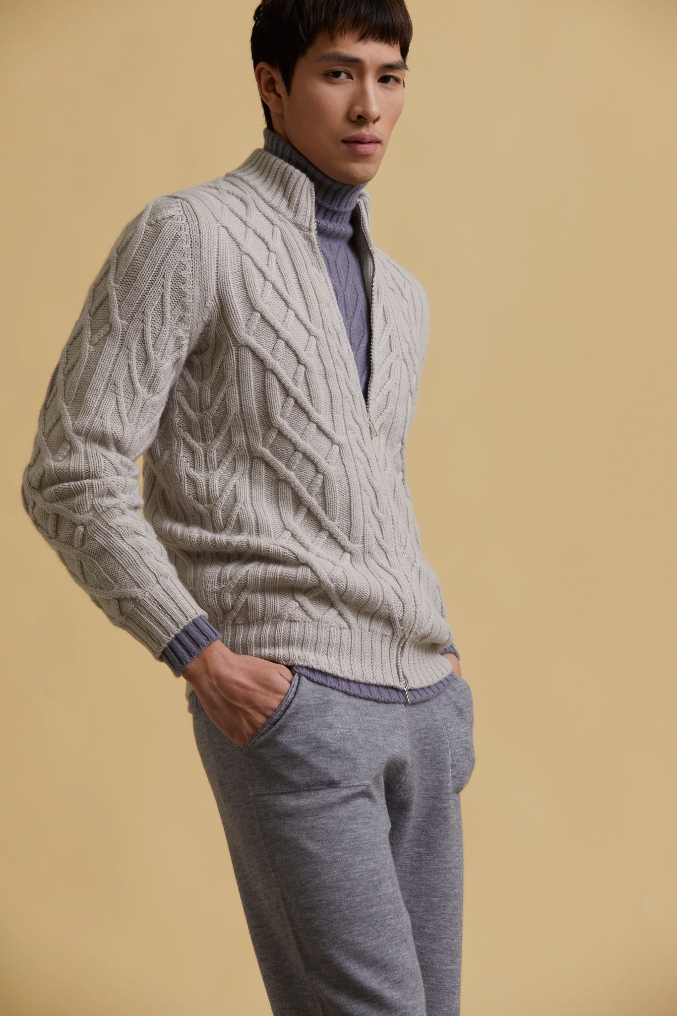 Full-zipped aran sweater in cashmere